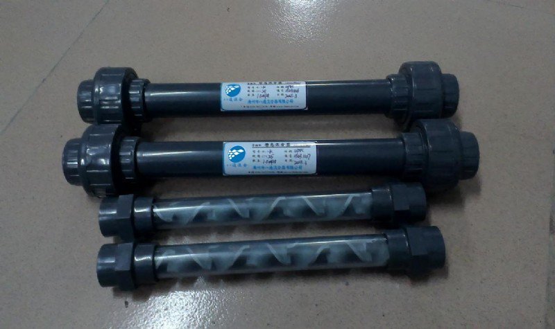 圖片上透明材料靜態(tài)混合器材料:QJ-SK型,透明PVC外殼+316L不銹鋼。
